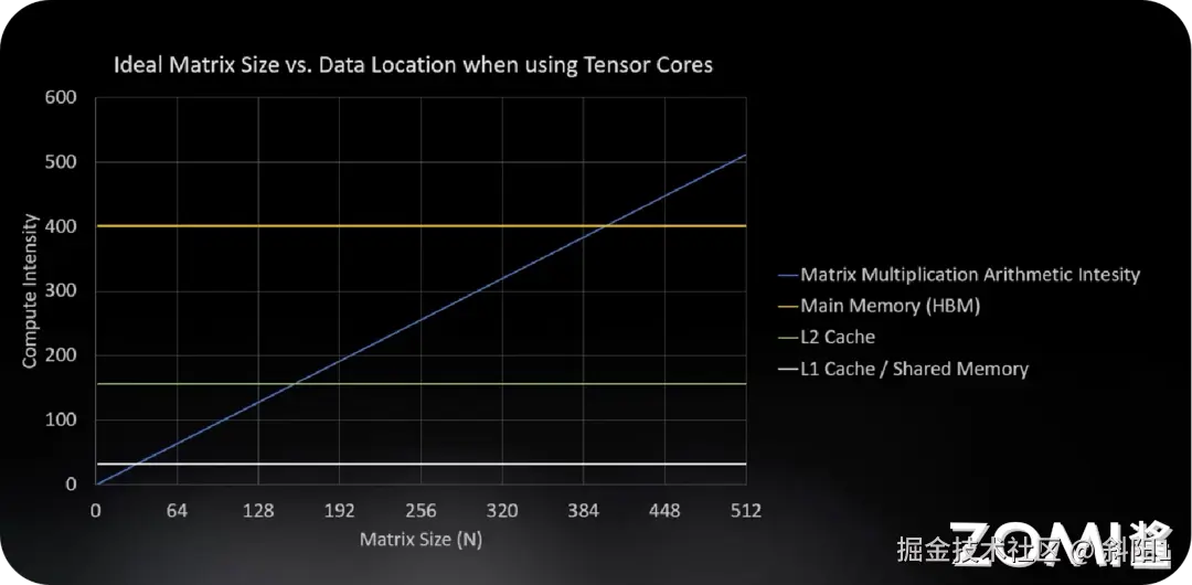 计算强度和矩阵维度的大小密切相关,图中蓝线表示矩阵乘法的算术强度随着矩阵的大小增大线性增加,橙色的线表示 GPU FP32 浮点运算的计算强度,橙色线与蓝色线的交点表示当计算单元充分发挥计算能力时矩阵的大小约为 50,此时满足整个 GPU FP32 的计算强度,实现理想情况下计算和搬运数据之间的平衡。