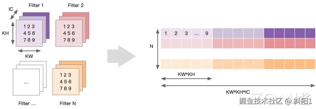 对权重数据进行重排,即以卷积核大小为步长展开后续卷积窗并存在矩阵下一列。将 N 个卷积核展开为权重矩阵的一行,因此共有 N 行,每个向量上先排列第一个输入通道上 KH*KW 数据,再依次排列之后的通道直到 IC。