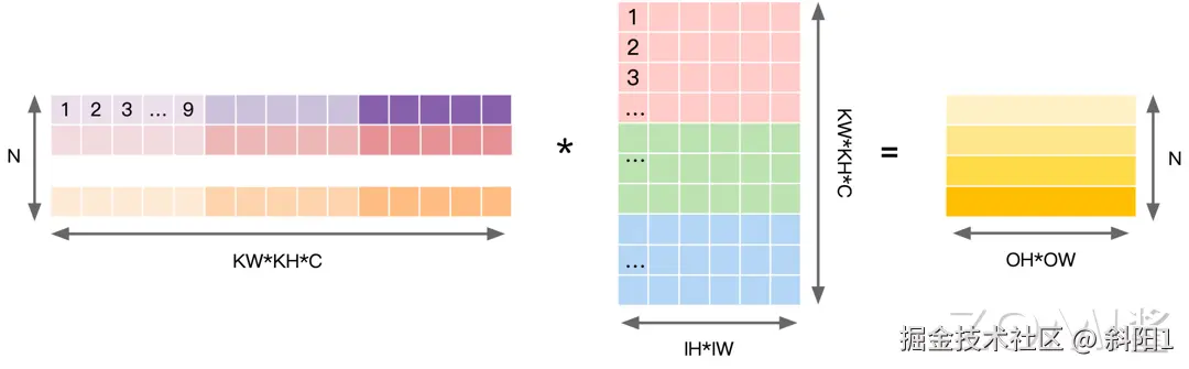 通过这种方式,原始的图像数据被重塑成一个二维矩阵,其中每一列对应于卷积核在输入图像上滑动时所覆盖的区域。行数对应输出 个数,每个行向量中,先排列计算一个输出点所需要输入上第一个通道的 个数据,再按照次序排列之后的通道,直到第 IC 个通道。在实际应用中,Img2col 通常与矩阵乘法库(如 BLAS)结合使用,以便利用高效的矩阵乘法实现卷积运算,这种技术在提高卷积神经网络的计算效率和加速训练过程中起着重要作用。