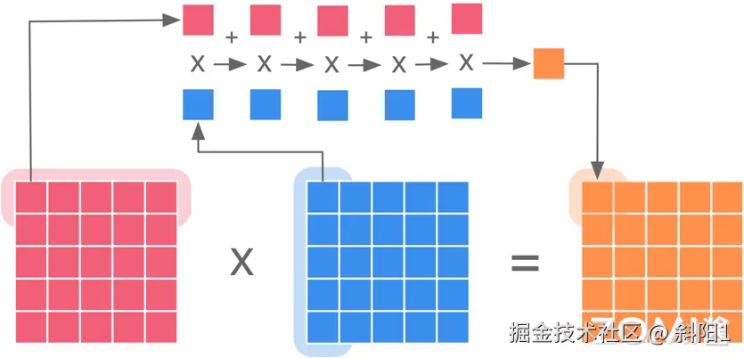 因此矩阵乘法的计算强度用时间复杂度表示为 ,随着相乘的两个矩阵的维度增大,算力的需求将不断提高,需要搬运的数据量也将越大,算术强度也随之增大。