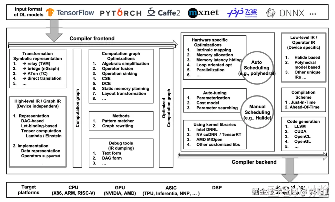 编译器后端的组成集中展示再上图中间靠右部分。首先进行硬件特定的优化,包括内在映射、内存分配、内存延迟隐藏、循环优化、并行化等;这些优化通过自动调度(如多面体模型)和手动调度(如 Halide)进行;自动调优模块包含参数化、成本模型和参数搜索,旨在进一步优化性能;后端还利用内核库(如 Intel DNNL、NV cuDNN/TensorRT、AMD MIOpen 等)来提高效率;低级 IR/操作符 IR(设备相关)采用 Halide、多面体模型等独特的 IR 实现;编译方案支持即时(Just-In-Time)和提前(Ahead-Of-Time)编译;最终,代码生成模块将生成 LLVM、CUDA、OpenCL、OpenGL 等代码,以支持各种目标平台,包括 CPU(X86、ARM、RISC-V)、GPU(英伟达、AMD)、ASIC(TPU、Inferentia、NNP 等)和 DSP 等,从而适配越来越多的加速器。