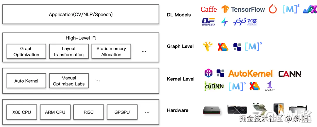 来到最顶层,则是一众深度学习的框架。包括稍早期的 Caffe、TensorFlow,以及目前较为主流的 PyTorch、MindSpore、JX、OneFlow,还包括国内诸多厂商自研的 AI 框架例如 Jittor、PaddlePaddle 等。