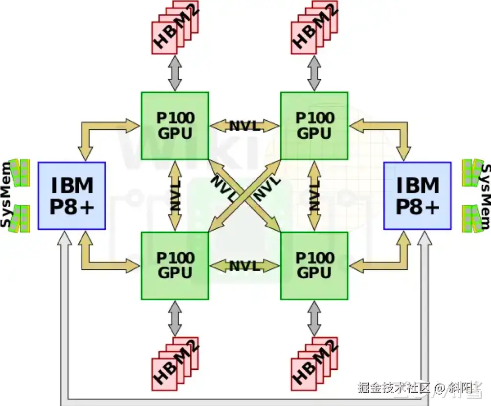 初代 DGX-1 通常采用了一种类似于上图的互联形式。不过,IBM 在基于 Power8+微架构的 Power 处理器上引入了 NVLink 1.0 技术,这使得英伟达的 P100 GPU 可以直接通过 NVLink 与 CPU 相连,而无需经过 PCIe 总线。这一举措实现了 GPU 与 CPU 之间的高速、低延迟的直接通信,为深度学习和高性能计算提供了更强大的性能和效率。