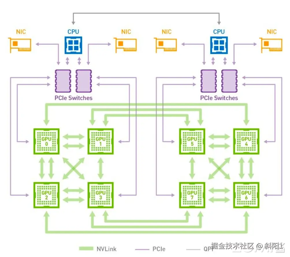 在英伟达推出其创新的 NVLink 和 NVSwitch 互联技术之前,构建强大计算节点的常规方法是通过 PCIe 交换机将多个 GPU 直接连接到 CPU,如下图所示。这种配置方式依赖于 PCIe 标准,尤其是 PCIe 3.0 版本,它为每个通道提供了大约 32GB/s 的双向带宽。虽然这在当时被视为高效的数据传输方式,但随着 AI 和机器学习领域的快速发展,数据集和模型的规模呈指数级增长,这种传统的 GPU-CPU 互联方式很快成为了系统性能提升的瓶颈。