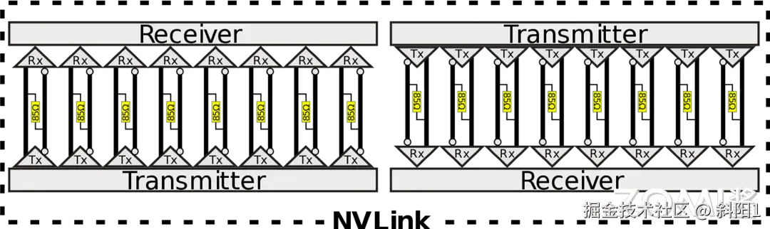 在 NVLink 的链接架构中,一个关键的概念是“Brick”,它指的是 NVLink 通道的基本单元。如上图所示,每个 NVLink 是一个双向接口,由 8 个差分对组成,总计 32 条线。这些差分对采用直流耦合(DC coupled)技术,并配置有 85 欧姆的差分终端,以优化信号传输质量。