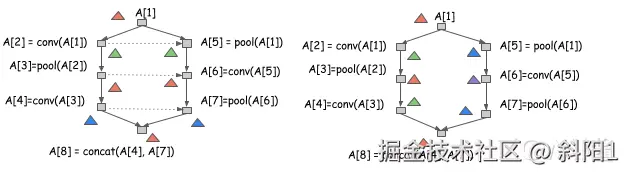 如下图所示,左右分别为两种不同的内存分配方案,以串行方式运行从 A[1] 到 A[8],那这两种分配方案是都有效的。然而左侧的分配方案引入更多的依赖,意味着不能以并行方式运行 A[2] 和 A[5] 的计算,而右边可以运行,因此右侧的分配方式更为高效。