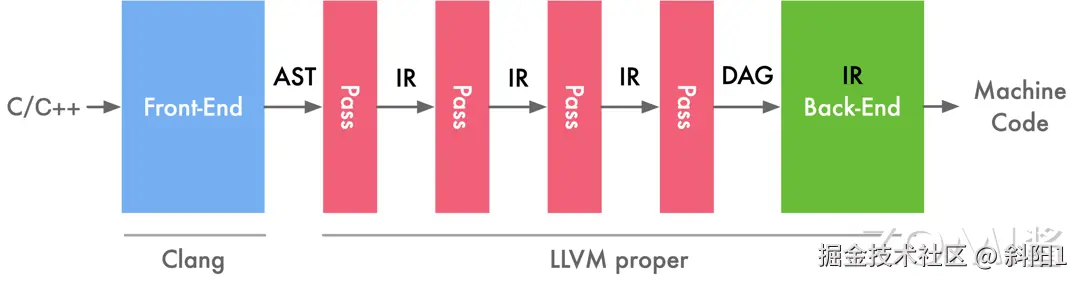 值得注意的是,LLVM 并非使用单一的 IR 进行表达,前端传给优化层时传递的是一种抽象语法树(Abstract Syntax Tree,AST)的 IR。因此 IR 是一种抽象表达,没有固定的形态。