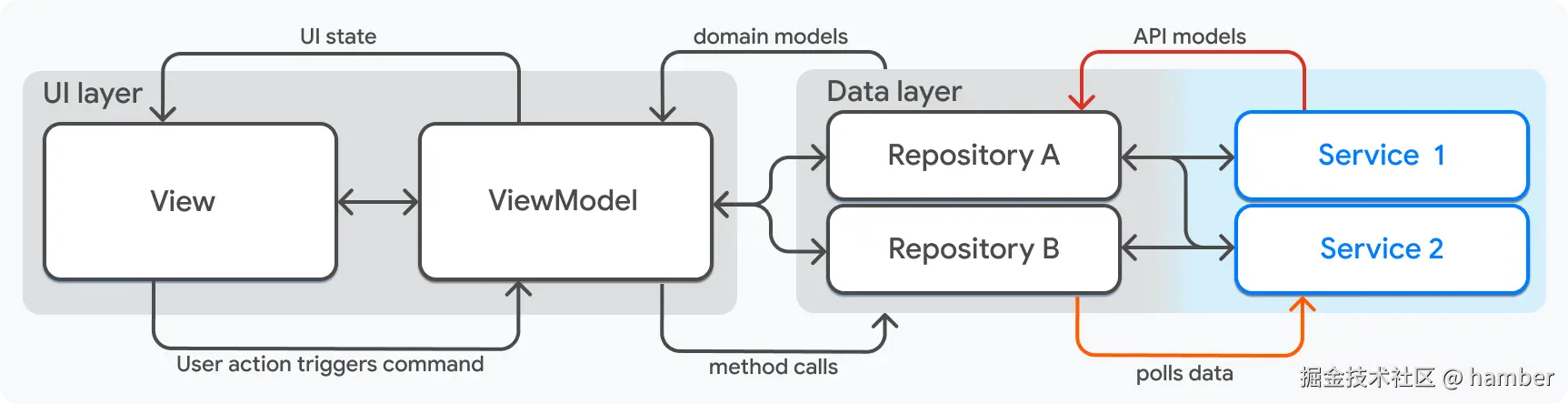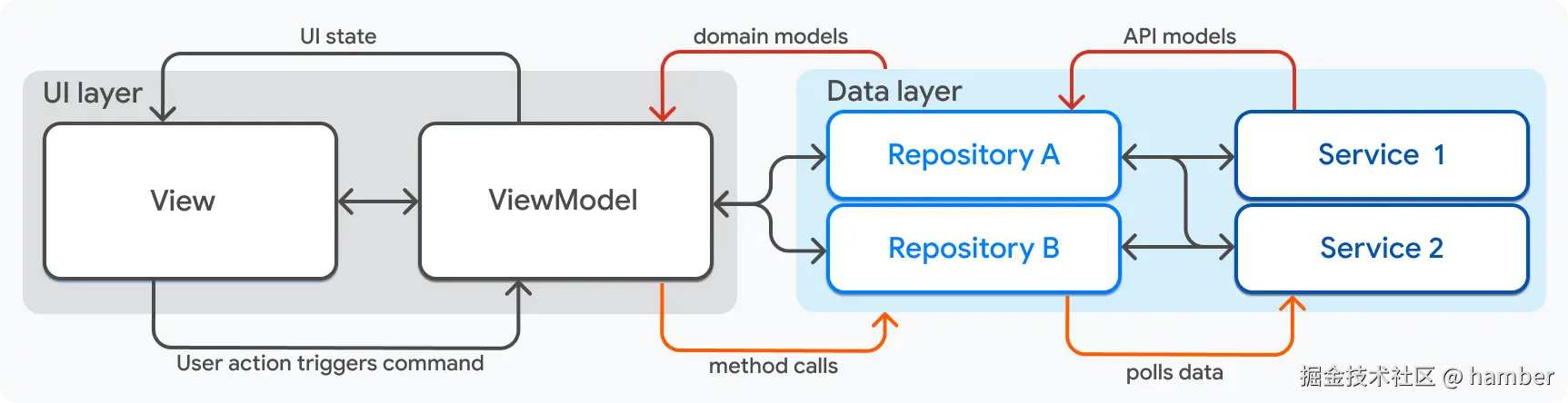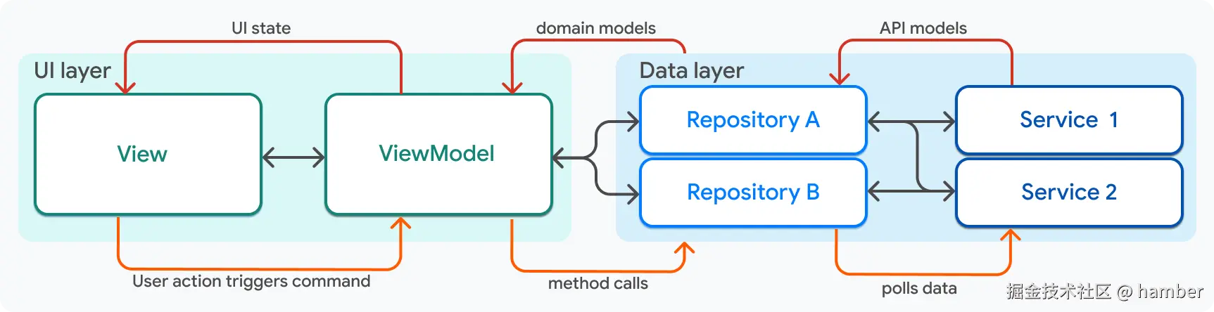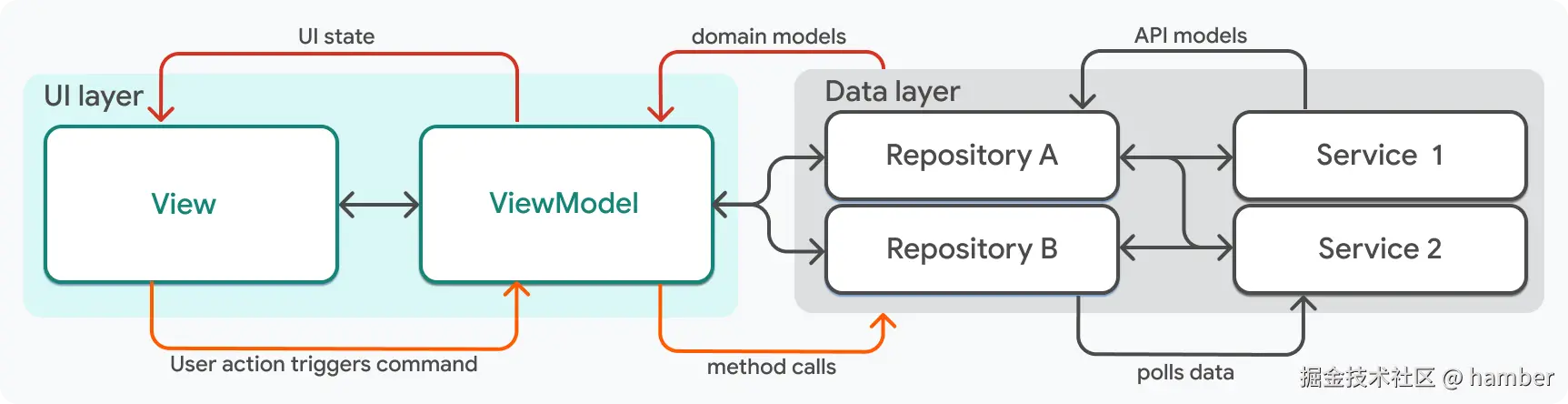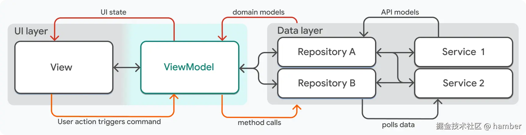 - 仓库和服务代表了应用的数据,属于 MVVM 的模型层。