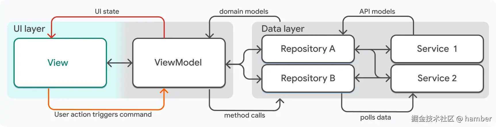 | 职责分离 | 在 UI 层使用视图模型和视图(MVVM) | 强烈推荐 | 此分离方式使代码更少出错,因为组件保持“无状态”。 |