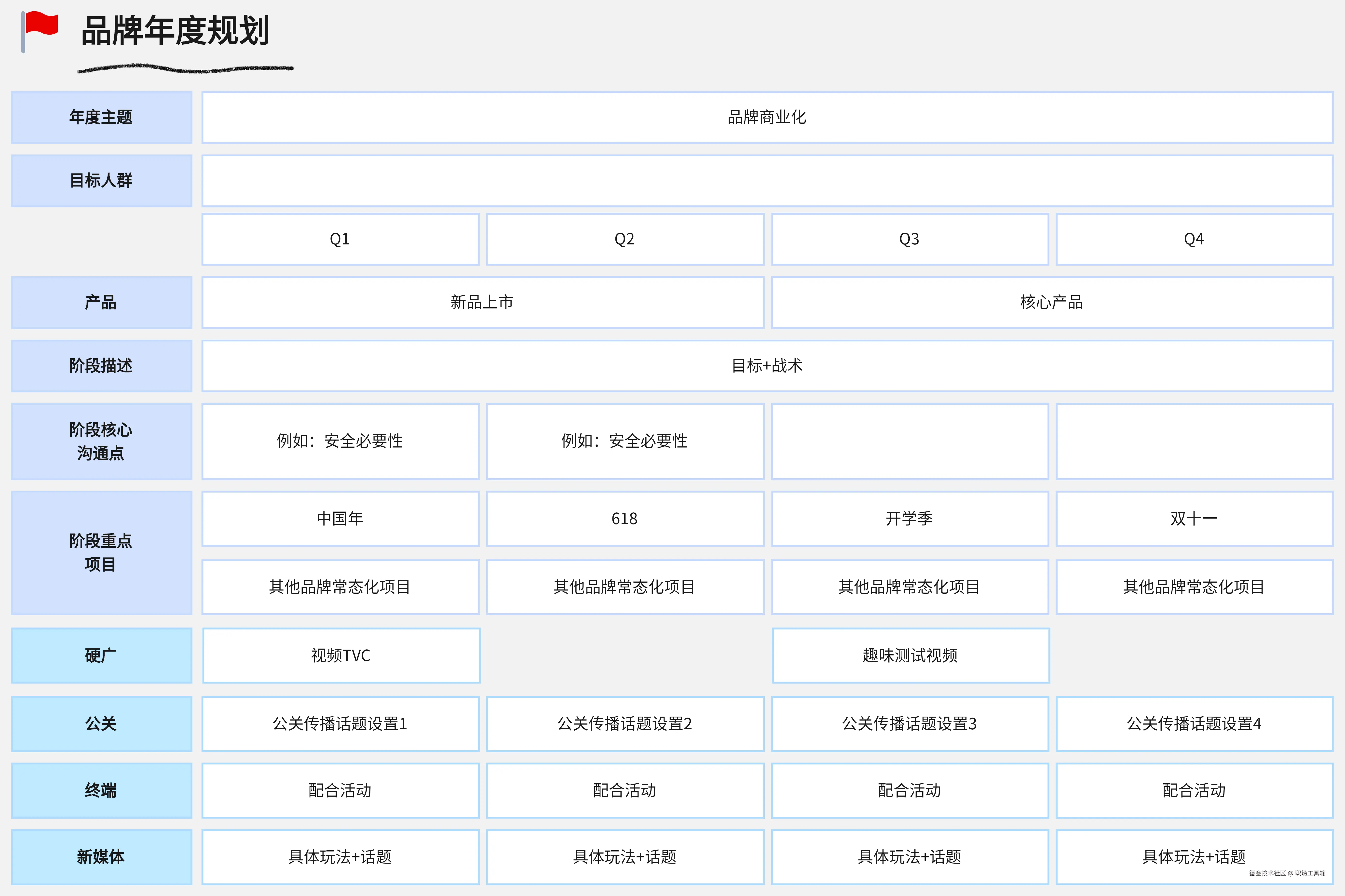 品牌年度规划模板是企业在每一年度制定的关于品牌发展的计划和战略。它包括一系列的目标、策略、计划和活动,旨在推动品牌在市场上的表现,提高品牌的认知度、形象和价值。这个模板帮助品牌团队明确年度主要目标,并制定相应的传播策略。