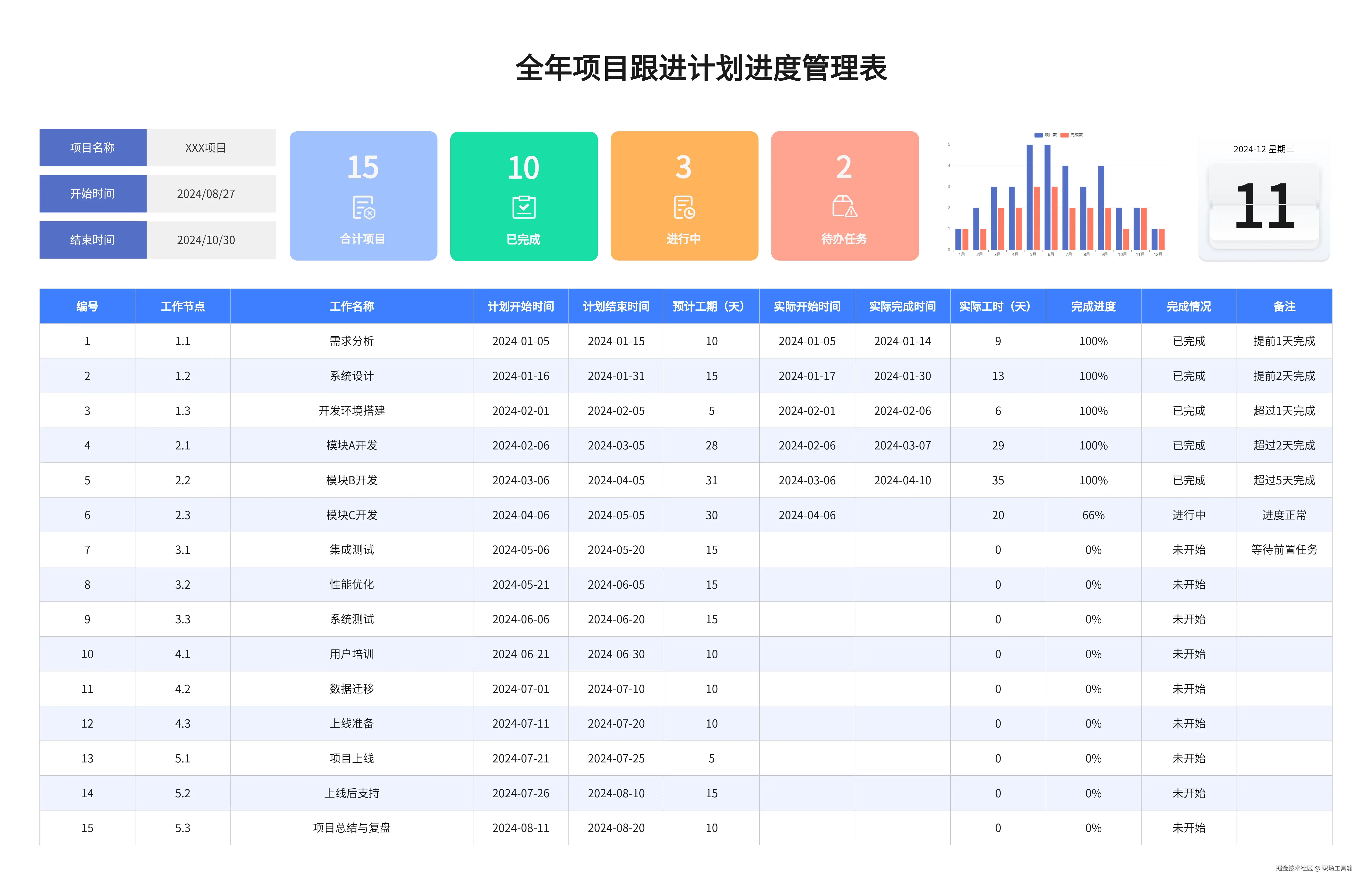 全年项目跟进计划进度管理表模板为项目管理提供了一种全面的跟进和监控工具。这个模板通过将项目分解为具体任务和阶段,帮助项目经理和团队成员清晰地掌握项目进度。每个任务都配有明确的目标、开始和结束日期、责任人和资源需求,使得任务分解更加细致,便于管理和调整项目进度,确保项目按时完成。