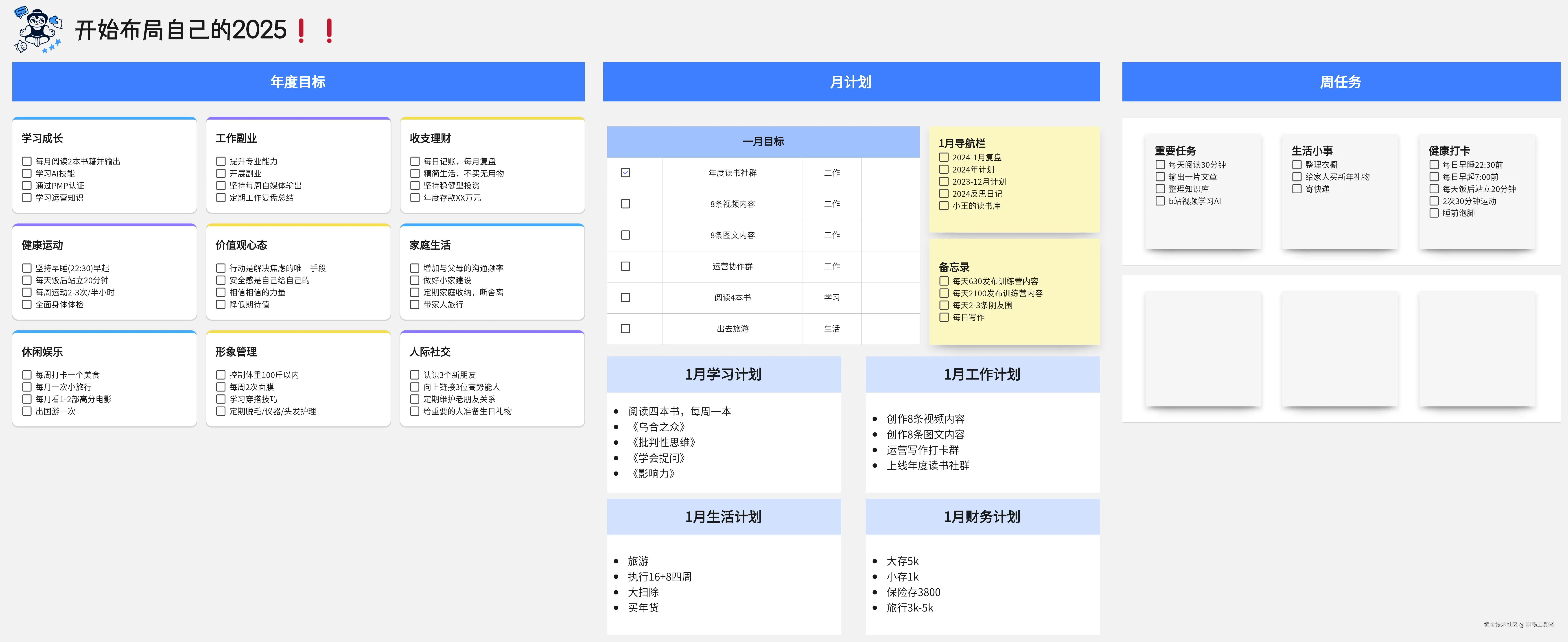 从我了解到的,身边有不少卷王已经开始布局2025年度计划,准备在新的一年大展拳脚、大干一场,那么问题来了,年度计划该怎么写?是否有合适的框架或年度计划模板,避免让好端端的年度计划变成流水账……