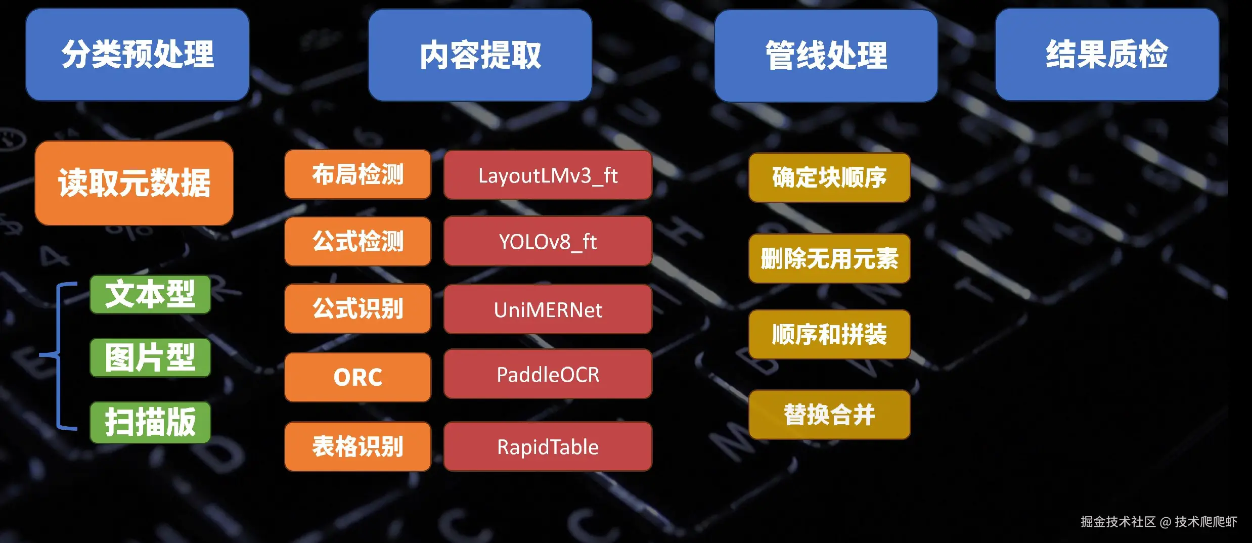 - 布局检测:主要任务是定位文档中不同元素的位置。这里使用的模型主要是微调过的LayoutLMv3模型。