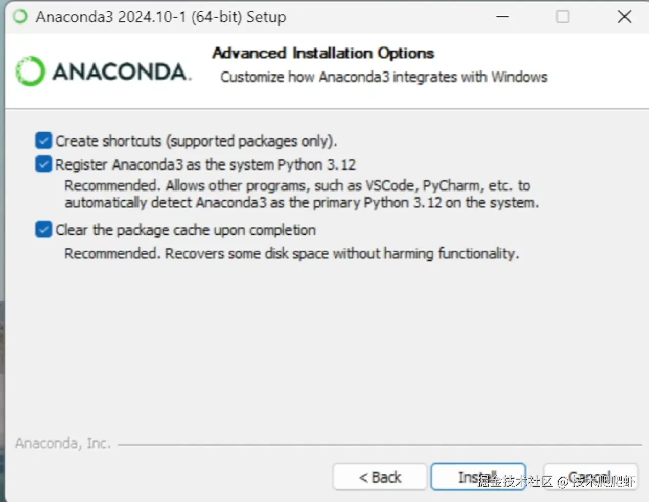 这是一个Python项目,它的部署前提是电脑上需要先安装一个Conda,然后使用Conda创建Python的虚拟环境。我们进入这个地址repo.anaconda.com,这里有一个installer,我们点击一下,找到自己操作系统的最新版本,把它下载下来。我是Windows系统,我下载这个X86_64的。下载完成以后,我们把它安装一下,这里一直点击下一步,到这一步,把这三个勾都选上,然后点击安装。