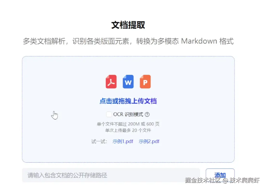 这里可以上传一个PDF文件,或者是Word还有PPT文件。如果PDF文件是扫描版的,我们需要把这个OCR识别勾上,然后上传一个文件。
