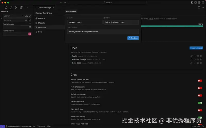 Cursor 允许你添加和索引第三方文档,并将其用作聊天中的上下文。你可以通过键入 @Docs > 添加新文档来执行此操作。将出现一个模式,你可以在此添加指向 /llms-full.txt 文件的链接。你将能够像任何其他文档一样将其用作上下文。