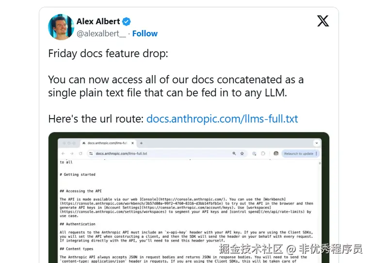 Anthropic 的 Claude Relations 负责人 Alex Albert 宣布 X 上支持 llms.txt。
