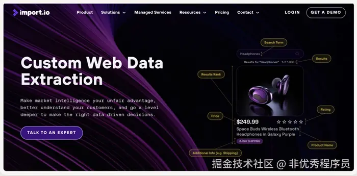 Import.io 提供了一个网页数据提取平台,使企业能够高效地收集、处理和利用来自网站的大量数据。他们的人工智能驱动工具和托管服务通过将网页数据转化为可操作的见解,支持电子商务、旅游和市场研究等各个行业。这使公司能够做出数据驱动的决策,增强市场情报并提高运营效率。