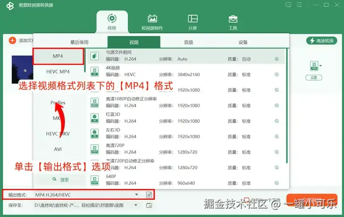 第二步:单击【输出格式】选项,选择视频格式列表下的【MP4】格式。