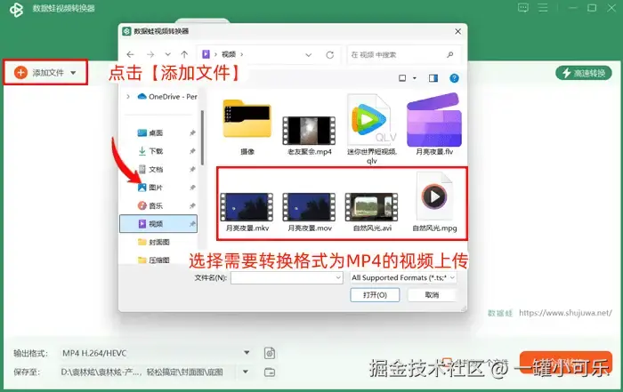 第一步:打开运行该视频转换器,进入格式转换界面,点击【添加文件】,打开本地文件夹,选择需要转换格式为MP4的视频上传。