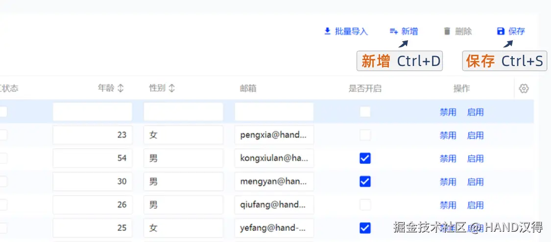 - 快速新增行:焦点在表格单元格内(非查询条区)时,按下 Alt + N(或 option + N);