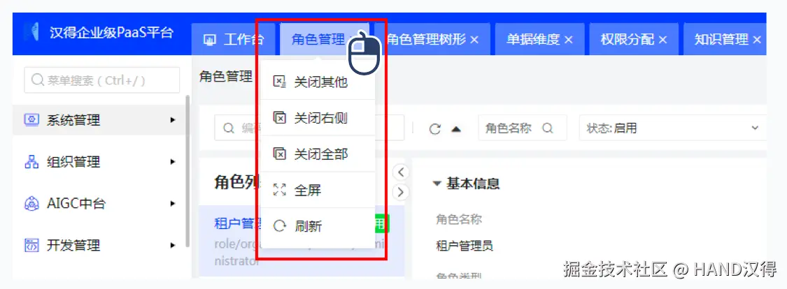 a. 通过在菜单页签上右键点击,您可以进行一系列快捷操作,包括关闭指定范围的页签、将界面切换至全屏模式、以及执行刷新等操作。