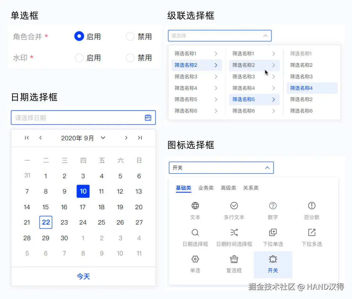 - 单选框 / 平铺选择框 / 分段控制器 / 日期选择框 / 级联选择框 / 图标选择框: