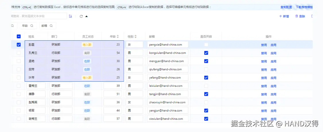 b. 在启用 Table 与 Excel 表格之间的数据复制、粘贴功能后,您还可以在表格内通过鼠标快速框选内容进行复制/粘贴操作(在涉及到可编辑单元格时,可配合按住 Shift 键进行框选)。