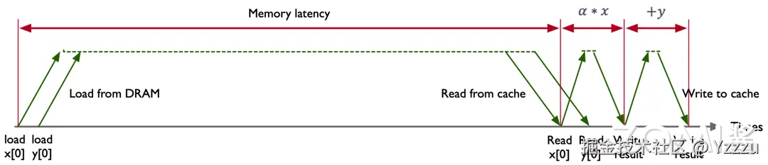 示例代码中包含 2 FLOPS 操作,分别是乘法(Multiply)和加法(Add),对于每一次计算操作都需要在内存中读取两个数据, 和 ,最后执行一个线性操作,存储到 中,其中把加法和乘法融合在一起的操作也可以称作 FMA(Fused Multiply and Add)。