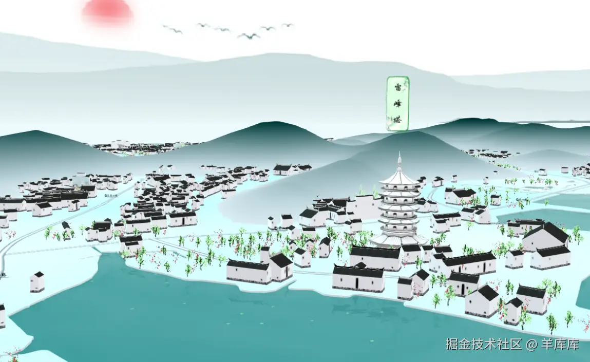 放上国风十足的地形与小镇模型,换上意境十足的天空盒、打上古风雅韵的三维标签,一副水墨风格的场景便勾勒出来,小镇依山傍水,错落有致,青砖黛瓦间透露出古朴与宁静,水墨风格的场景,如同一幅流动的画,将古代与现实巧妙地融合在一起。