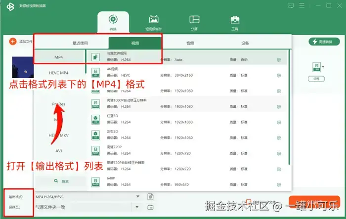 第二步:点击打开【输出格式】列表,选择视频格式,点击该格式列表下的【MP4】格式。