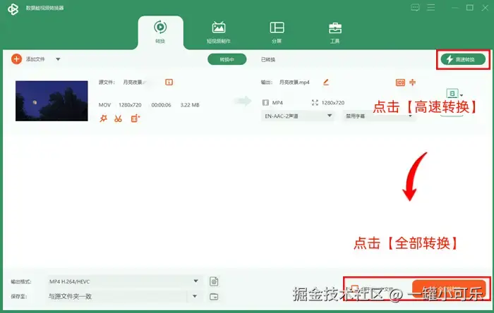 第三步:在格式转换界面中,点击【高速转换】提升视频的转换速度,然后点击【全部转换】即可。