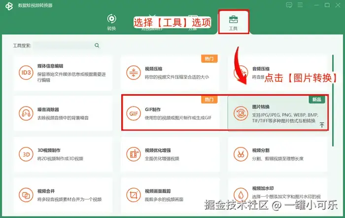 第一步:进入该格式转换应用中,选择【工具】选项,点击其功能版图界面中的【图片转换】功能。