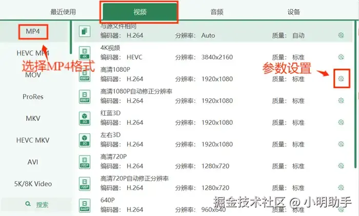 第三步: 点击界面上方的视频,选择【MP4】格式。有需要的话,也可以点击右侧小齿轮按钮进行视频质量、帧率等参数设置。