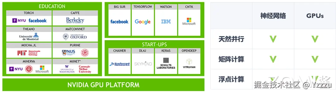 从 2005/2006 年开始,一些研究人员开始尝试使用 GPU 进行 AI 计算,但直到 2012/2013 年,GPU 才被更广泛地接受。随着神经网络层次越来越深、网络规模越来越大,GPU 的加速效果越来越显著。这得益于 GPU 相比 CPU 拥有更多的独立大吞吐量计算通道,以及较少的控制单元,使其在高度并行的计算任务中表现出色。