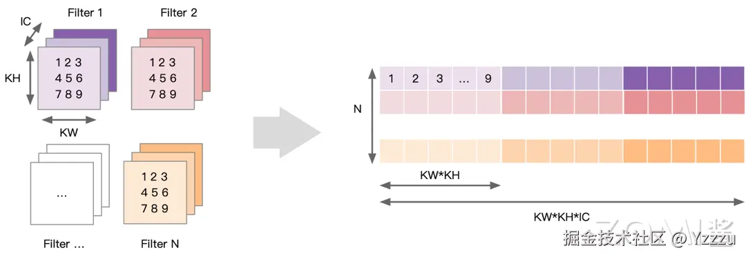 对权重数据进行重排,即以卷积核大小为步长展开后续卷积窗并存在矩阵下一列。将 N 个卷积核展开为权重矩阵的一行,因此共有 N 行,每个向量上先排列第一个输入通道上 KH*KW 数据,再依次排列之后的通道直到 IC。