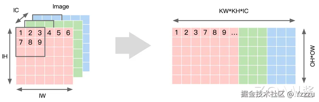 通过这种方式,原始的图像数据被重塑成一个二维矩阵,其中每一列对应于卷积核在输入图像上滑动时所覆盖的区域。行数对应输出 个数,每个行向量中,先排列计算一个输出点所需要输入上第一个通道的 个数据,再按照次序排列之后的通道,直到第 IC 个通道。在实际应用中,Img2col 通常与矩阵乘法库(如 BLAS)结合使用,以便利用高效的矩阵乘法实现卷积运算,这种技术在提高卷积神经网络的计算效率和加速训练过程中起着重要作用。