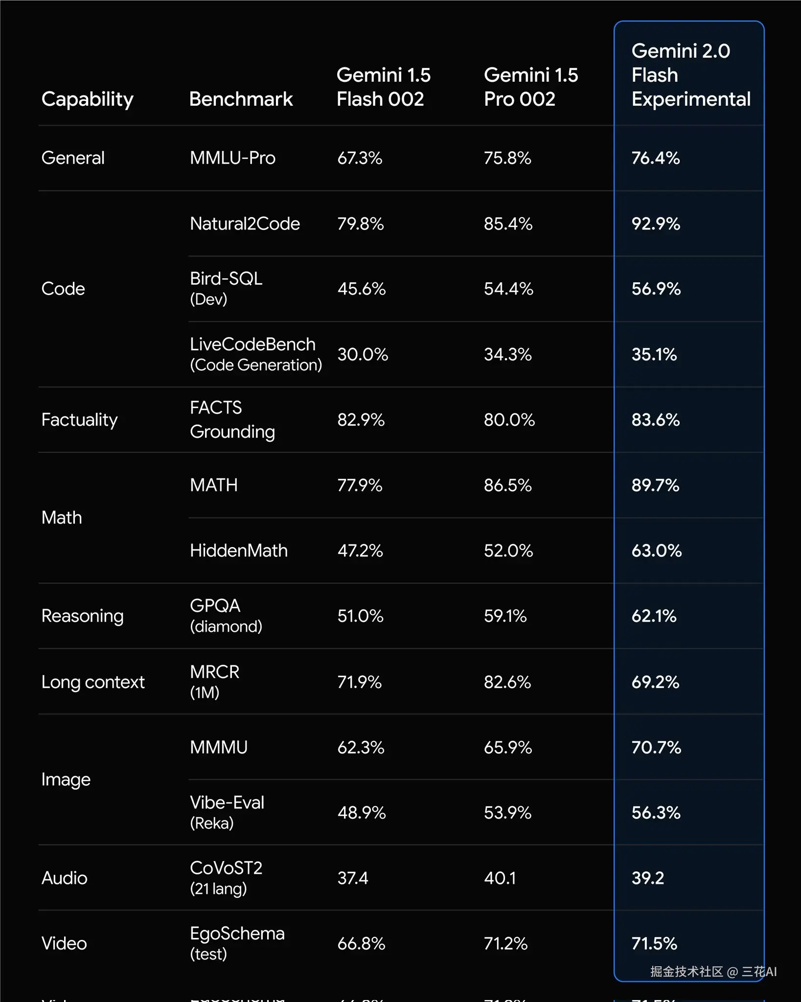在性能方面,Gemini 2.0 Flash 改进了多模态、文本、代码、视频、空间理解和推理性能。