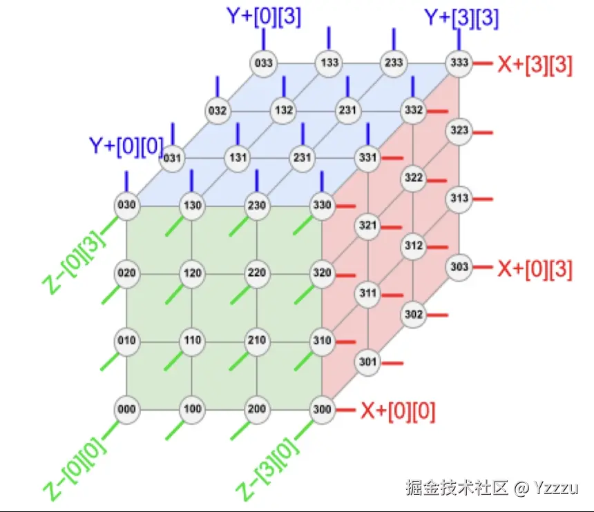 下图是一个 3D Torus Cube 的图示,我们可以看到每一个节点都会和上下、左右、前后的节点互联,而处于这个立方体边上的芯片会连接到在它相对面上的节点从而实现每一个节点都与 6 个节点互联。