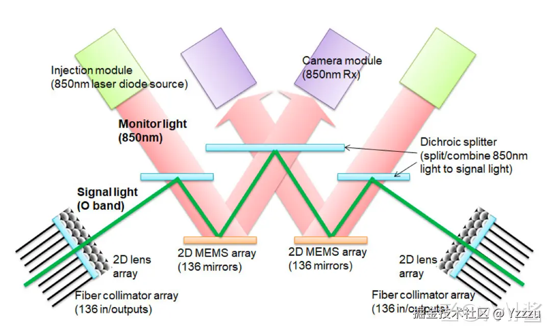 下面这个图解释了 Palomar OCS 的工作原理。绿色线条表示带内光信号路径。与带内信号路径叠加的是一个 850 纳米波长的监控通道(红色箭头),用于校准镜面。输入/输出的光学信号通过二维(2D)光纤准直器阵列(Fiber collimator array)进入光学核心,每个准直器阵列由一个 NxN 光纤阵列和 2D 透镜阵列组成。这个的核心是其中的两组 2D MEMS 阵列。MEMS 的镜面被在监控通道的校准下,被驱动、倾斜以将信号切换到相应的输入/输出准直光纤。