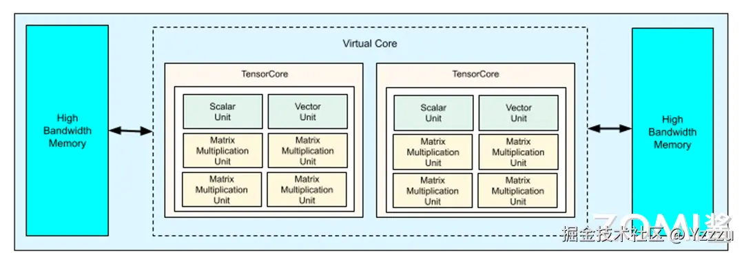 首先来看一下 TPU v4 的架构图,每个 TPU v4 都有两个 Tensor Core,每个 Tensor Core 里面有分别六个单元组成,其中有四个是 TPU 的最核心的脉动阵列 MXU,另外还有两个单元,一个是 Scalar Unit,另一个是 Vector Unit,这些都在前面的章节讲过。同时我们还看到两个 HBM 也就是内存模块,为了降低电缆的时延,它们分别被放在了 Tensor Core 的左右两边。