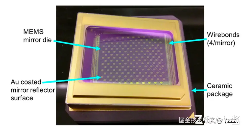 下图就是一个反射镜阵列的封装照片,在每个陶瓷封装内部是单个大型芯粒,芯粒里面有 176 个可单独控制的微反射镜。
