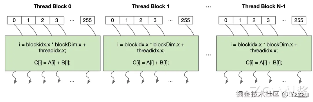 // 使用 blockIdx.x 和 blockDim.x 来访问块索引和块维度