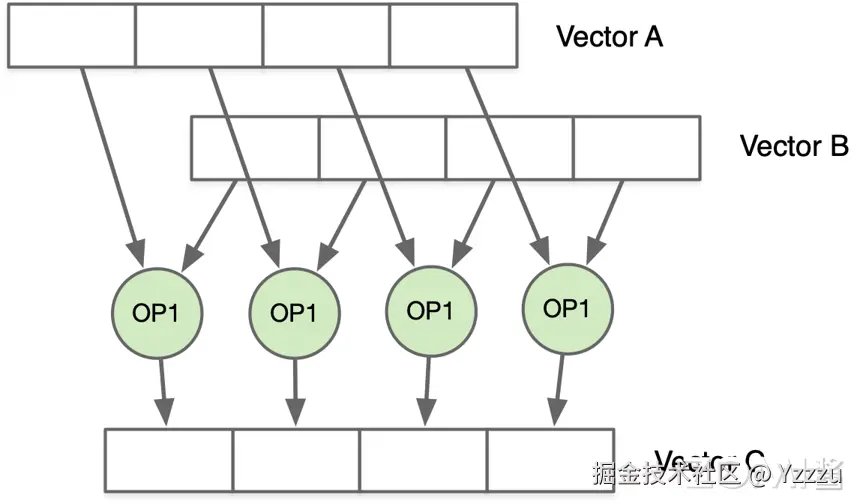 例如将两个 vector 作为操作数,对于两个 vector 的操作数进行相同的乘法操作,下面以 vector 为 4 个元素为例,将向量 A 和向量 B 进行相乘计算得到结果 C。