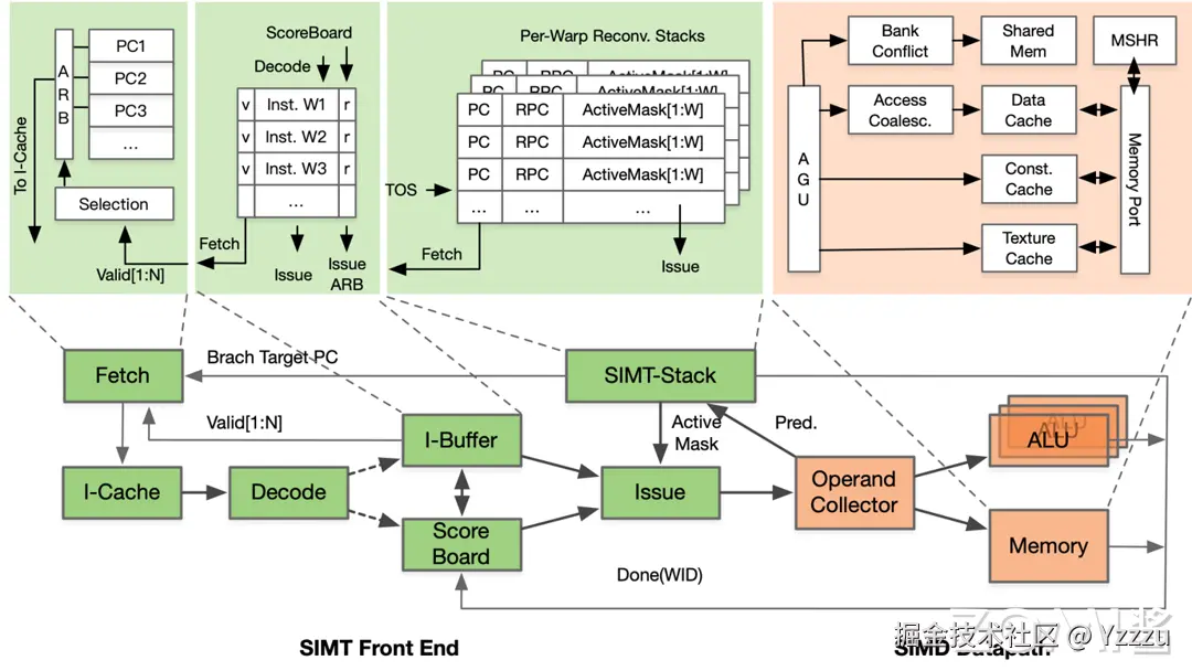 GPU 的 SIMT 可以看作是一个特殊的 SIMD 结构,SIMT 硬件核心流水可以被分为 SIMT 前端(SIMT front-end)和 SIMD 后端(SIMD back-end)。流水线中存在三个调度循环,分别是取指循环、指令发射循环和寄存器访问循环。