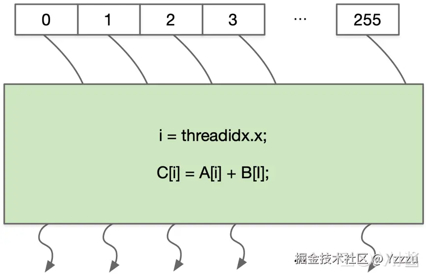 还是以之前的数组相乘 为例,两个等长数组 Vector A 与 Vector B,需要每个元素逐一对应相乘后得到 Vector C。SIMT 给每个元素分配一个线程,一个线程只需要完成一个元素的乘法,所有线程并行执行完成后,两个数组的相乘就完成了。