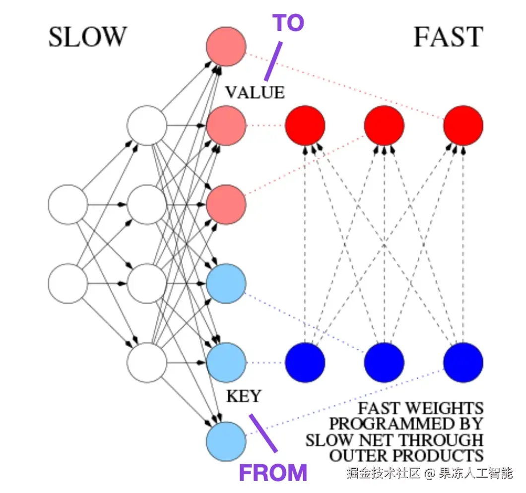 2021年,论文《Linear Transformers Are Secretly Fast Weight Programmers》则明确展示了线性化自注意力和1990年代的快速权重编程之间的等价性。”