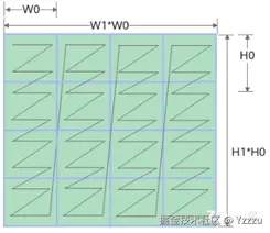 如下图所示,NZ 分形操作中,整个矩阵被分为(H1 * W1)个分形,分形之间按照列主序排布,即类比行主序的存储方式,列主序是先存储一列再存储相邻的下一列,这样整体存储形状形如 N 字形;每个分形内部有(H0 * W0)个元素,按照行主序排布,形状如 Z 字形。