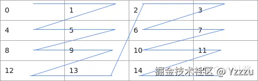 为了在达芬奇架构中更高效的搬运和进行矩阵计算,引入一种特殊的数据分形格式,NZ 格式。 如下图所示,我们以 4*4 的矩阵来进行举例,按照 NZ 格式数据在内存中的排布格式为[0,1,4,5,8,9,12,13,2,3,6,7,10,11,14,15],按照 ND 格式数据在内存中的排布格式为[0, 1,2,3,4,5,6,7,8,9,10,11,12,13,14,15]。