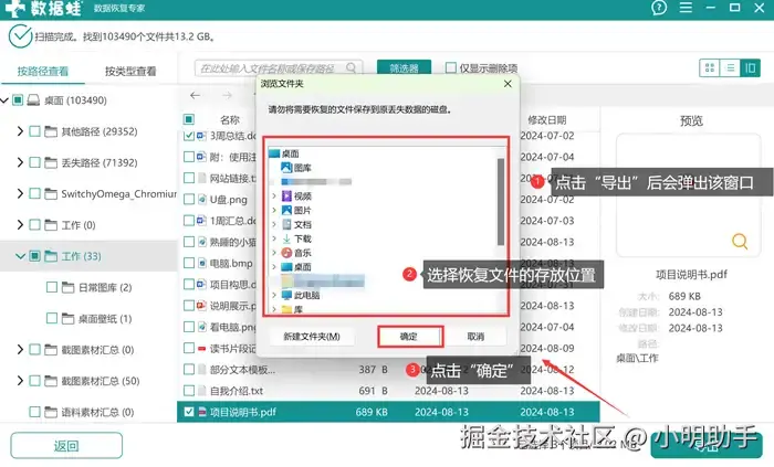第3步: 点击“导出”后,选择恢复文件的存放位置即可。